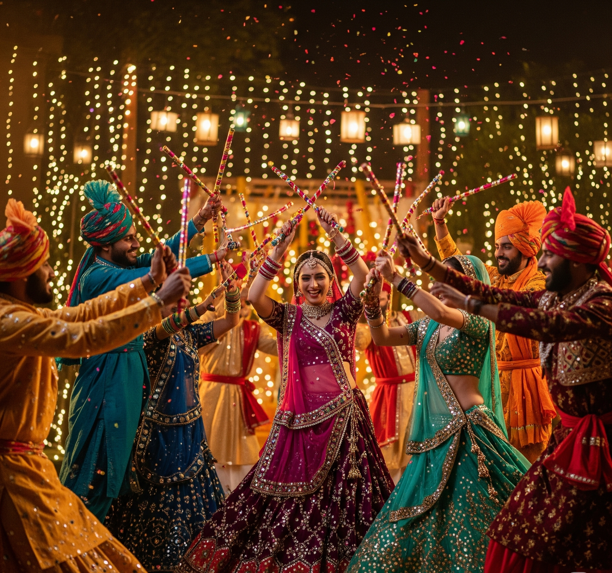 • Dandiya Nights: A more playful and energetic celebration, where sticks clash in rhythm, creating both sound and spectacle.