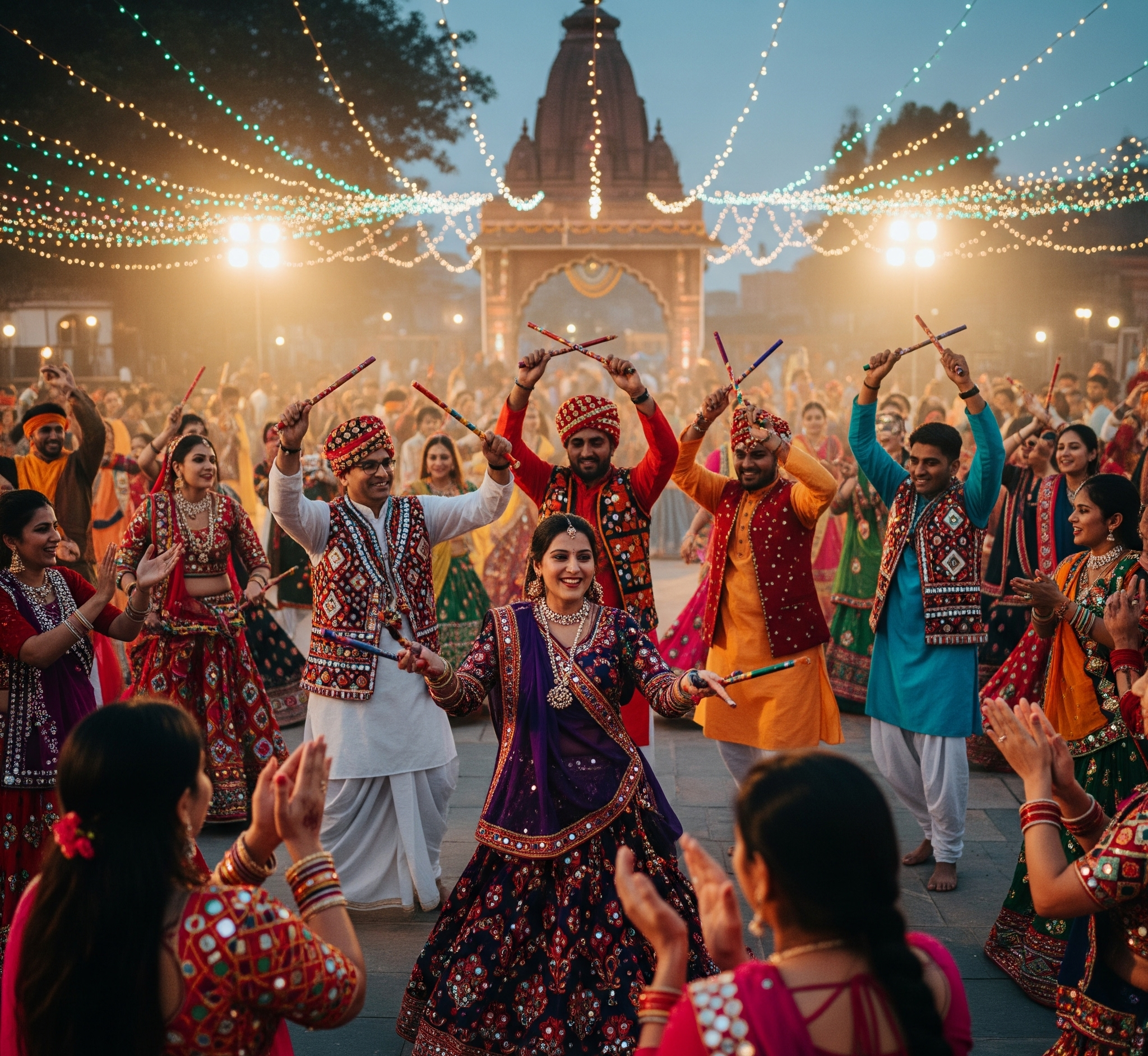 The sound of dhol beats, the swirl of colorful ghagras, men in vibrant kediyus, and the sparkle of lights—Navratri is not just a festival, it’s India’s grandest dance celebration. From Garba glam evenings to high-energy Dandiya nights, the spirit of Navratri brings communities together in a burst of color, rhythm, and devotion.
